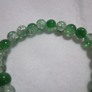 Handmade with crackle, glass beads & a silver tone, metal W charm. This bracelet is stretch.
