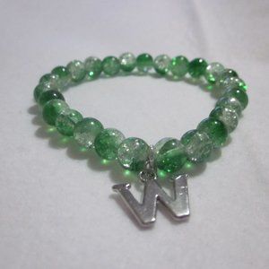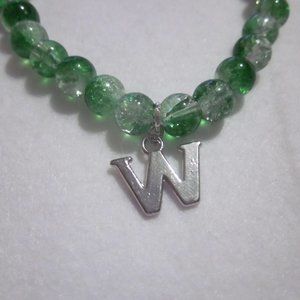 Green and White Two Tone Crackle Initial W Charm Bracelet.