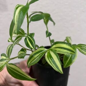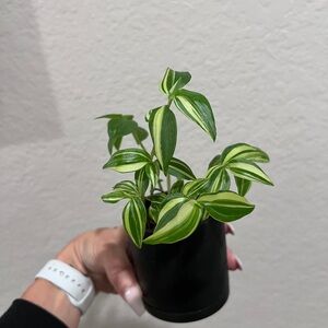 Beautiful green and white variegated tradescantia. Trailing habit. Sold IN this beautiful pot. Healthy and ready for a forever home, where she can come make many new plant babies for you! Pot is 3”.