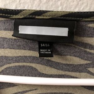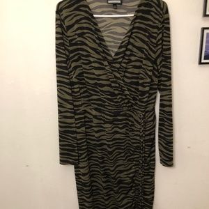 It is a long sleeve green dress with black animal stripes. There is a tie on the side that can adjust the one side of the dress to show off more leg.