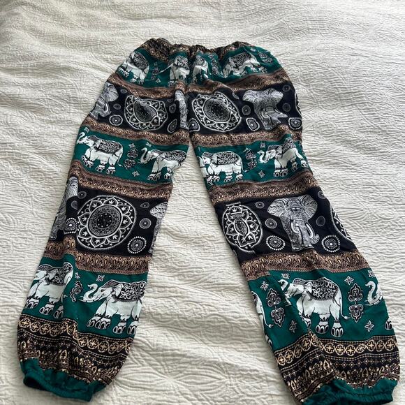 Green and brown elephant print harem pants waist stretches to 32” inseam 27”