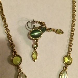 Three different color green and gold necklace & earring set. Necklace is 16" long / 18" w extender. Earrings are 1.5" long.