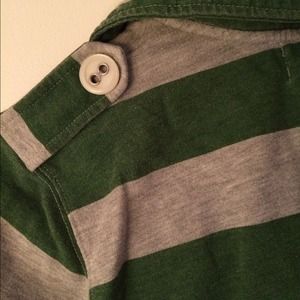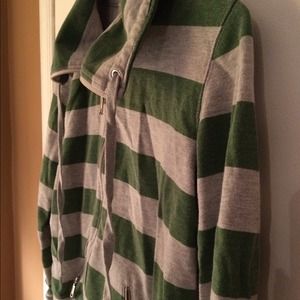 Very cool looking green and gray striped zip up sweatshirt. Ties at neck or can let loose, neat button detail EUC⚡️Buy 3 items listed at $15 and under for $25⚡️