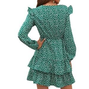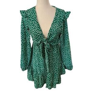 Green and white polka dot mini dress. Deep V neck. Size M,L. Elastic waist.long sleeve with elastic wrists.