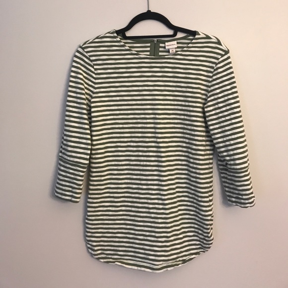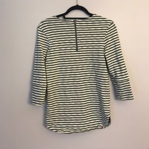 Green and white striped cotton shirt from Target. Cute zipper detail in the back and fun bottom hem (both pictured above). This shirt can be casual with jeans or wear it with dress pants for work!