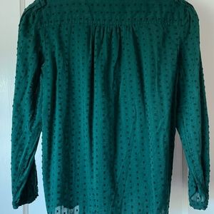An airy and flowing blouse in hunter green. Easy to wear between work or a casual night out. Swiss dots and ruffled sleeve cuffs add that small detail to any simple look. 100 % cotton for that breathable feel when on the go!