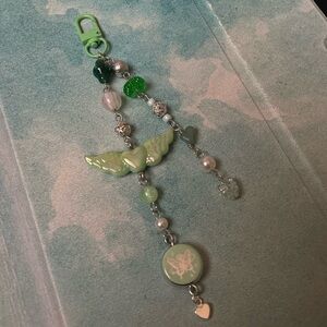 Handmade green beaded butterfly and angel wing heart keychain with silver colored wire
