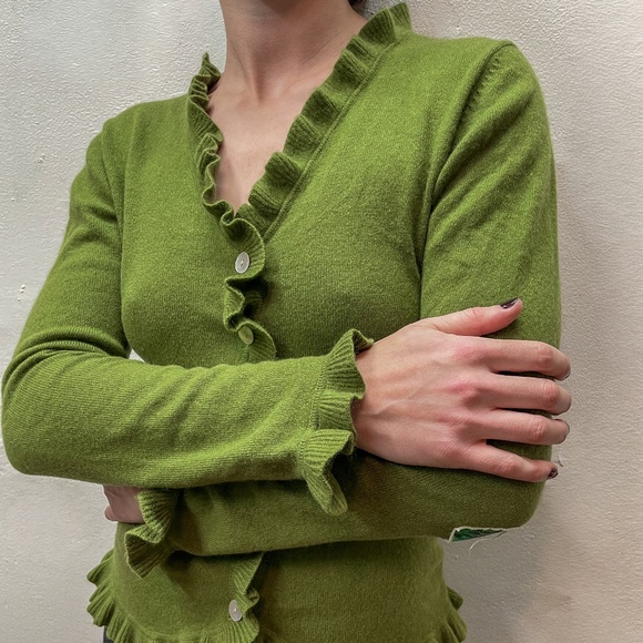 beautiful kelly green cashmere button down vneck cardigan with ruffle and elbow patch details. mother of pearl buttons. fits like size small