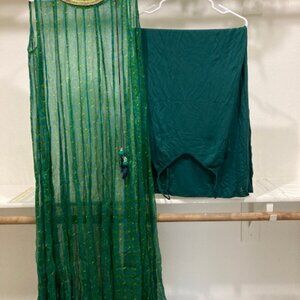 The green chiffon dress is full-length with embroidery on the neckline. It has a full-length petticoat to go under the dress.