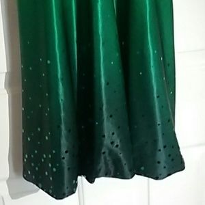 Short, satin, ombre green dress with shiny polka dots on the bottom.