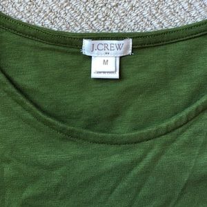 This is a adorable dress I bought from j crew. It is an olive green color and it appears to be wrapped. It goes to about your knees.