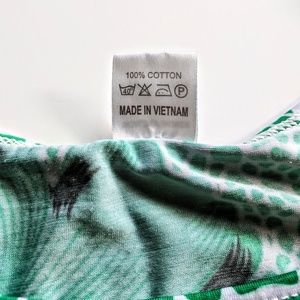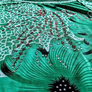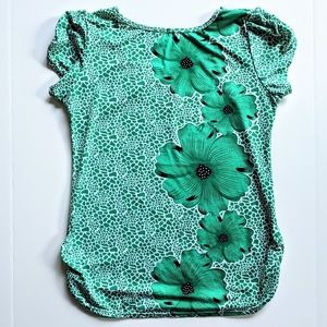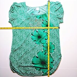 Pretty, comfortable and fun blouse with a beautiful large floral design in bright green. The fabric is smooth silky cotton. The sides are gathered in at the bottom, creating a flattering fit. Front has a square neckline and rhinestones for a bit of sparkle. Wonderful summer shirt!