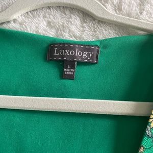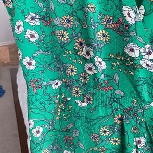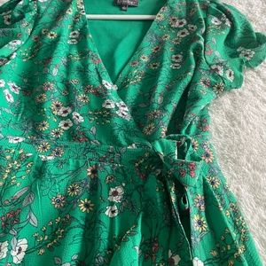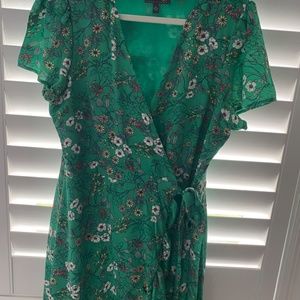 Short, to the knee, green floral wrap dress. Beautiful and flattering. Size large but will fit a woman’s medium or large as it is a wrap dress. Machine washable.