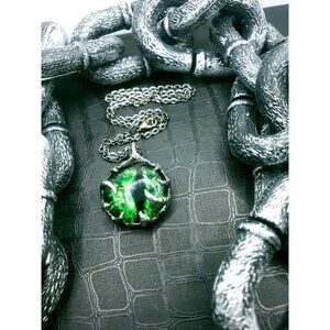 The vibrant colors of various green, yellow and black show at some angles and are completely brillant. The dangerous eye is secured with hand done spiky metalwork.