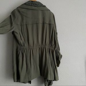 Green jacket, lightweight trench coat with embroidered detail.