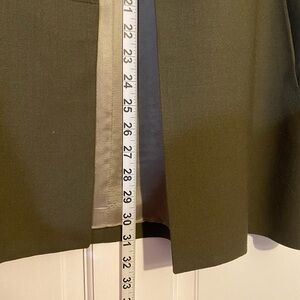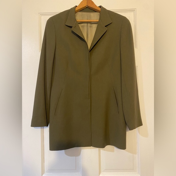 Long blazer over coat. Army green color. Can be worn dressed up or down. With heels or docs. Hidden bottons. Fine wool exterior and silk interior. Thrifted this item and ready to rotate. Tag was already removed when I acquired it so I don’t know the brand. Very cute item.