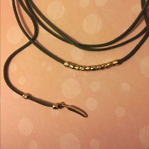 Green leather wrap necklace/ choker with gold beads on the middle and gold feather on the ends. Bought from a boutique and worn once