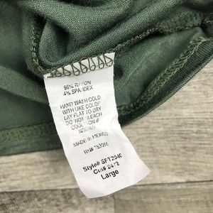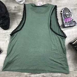 Army green tank top with black lace detailing at trim .