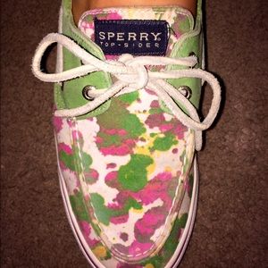 Green, pink, and yellow paint splatter Sperry
