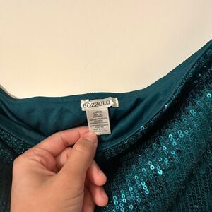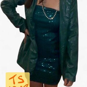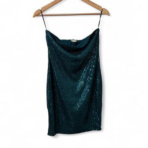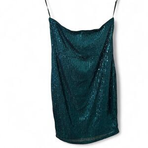 green sequined, strapless mini, glamorous, party outfit, stretchy fit, size large, sparkle dress, evening wear, club wear, flashy