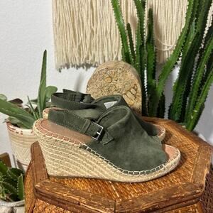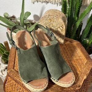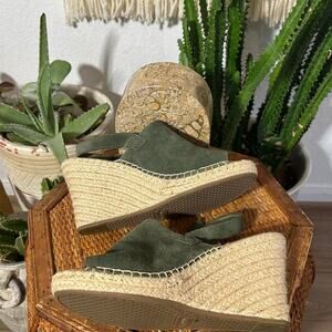Green suede wedge sandals with adjustable buckle straw rope heel TOMS