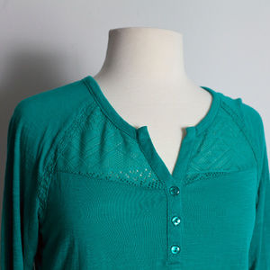 Greenish teal women’s top with cute details! Says size L, but fits like a M. Not sure of brand, though it was only worn and washed once, the brand name faded off the tag somewhat.