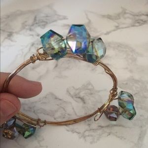 Gold wire wrap bangle with three clusters of three stones. Stones are iridescent with a green finish. Perfect to wear alone or to stack with other bangles and bracelets!