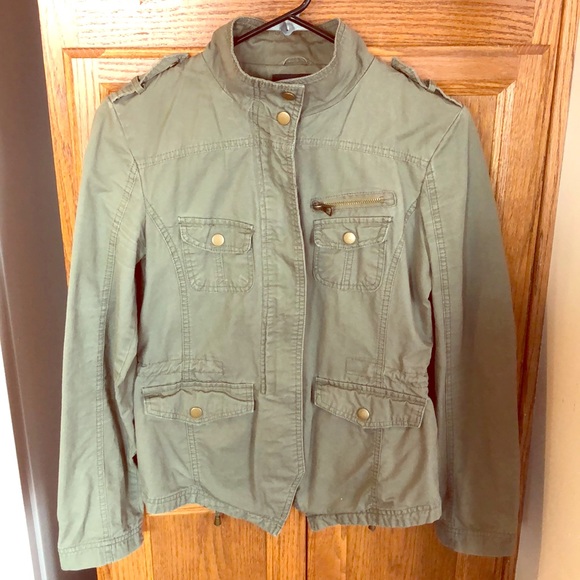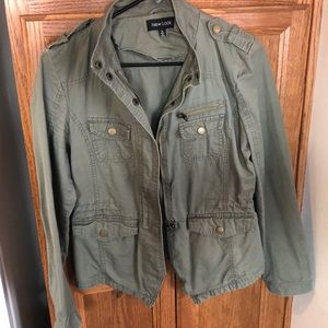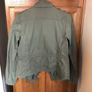 Thin green jacket, looks very cute on. Has strings to tighten waistline. Size small but can also fit a medium