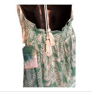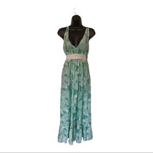 Green and off white floral low back maxi halter beachy crochet waist detail cover up dress size small new