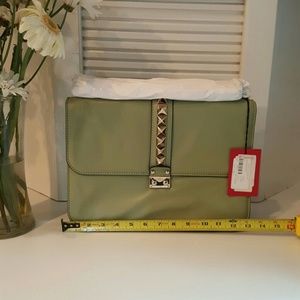 Mint green with envy rockstud valentino handbag with light gold hardware and chain strap. Extremely soft leather. I have never used this purse and the inside of the bag reflects this! Only minor dents in the leather due to my other rockstuds laying on this bag. I can show in additional pictures ( just ask!) This is my favorite purse!! Sad to see it go but It deserves to be shown off !! if interested ask for updated pics. while sitting it has become wrinkled. I don't know how to prevent this.