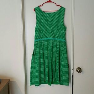 This dress is in excellent condition! It is a fit and flare dress with box pleats. Very flattering and fun. Perfect for date night or the office. Plus it has POCKETS! :)