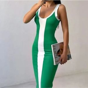 This style combines the classic elegance of green and white with a contemporary midi silhouette.