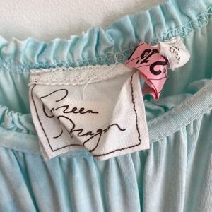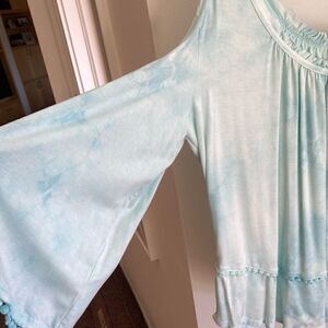 Green dragon light green three-quarter sleeve rayon blouse with pom-pom detail. Size large. Gently worn. Just dry cleaned. Open shoulder detail. Measures 24 inches long and 19 inches armpit to armpit