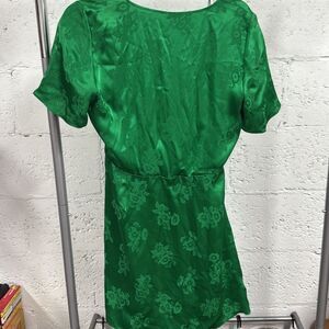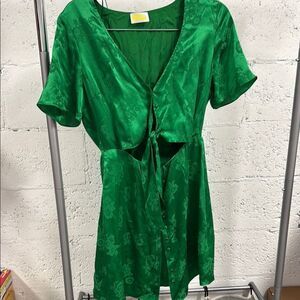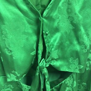Elegant green satin dress with floral pattern. Features a tie-front design and short sleeves.