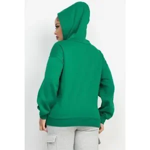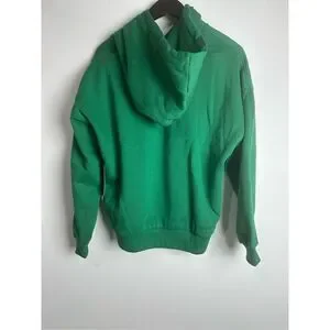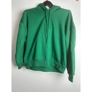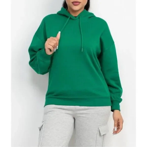 A hoodie and current trend jacket in solid color featuring a loose silhouette, a drawstring, long cuffed sleeves, a drop shoulder, and a hip length.