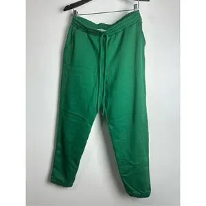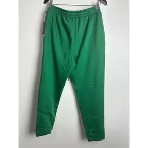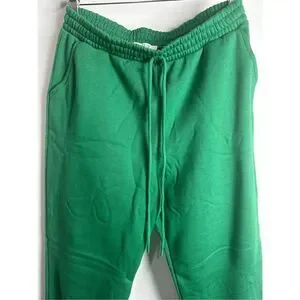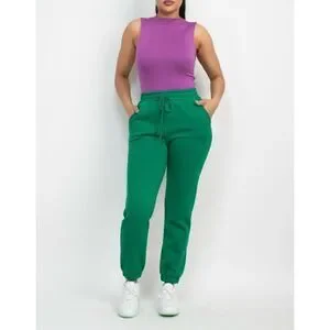 A knit must-have style pair of casual jogger pants in solid color featuring a high-rise waist, elasticized waistband with drawstring, side pockets, and a full cuffed length.