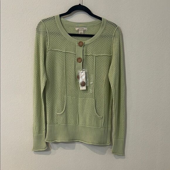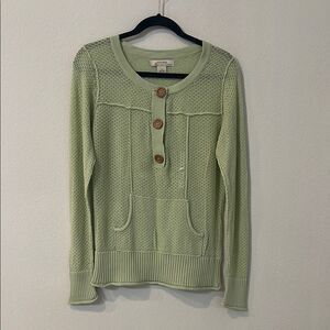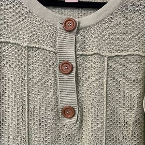 Stylish knit sweater with button accents. Features front pockets. Perfect for layering.
