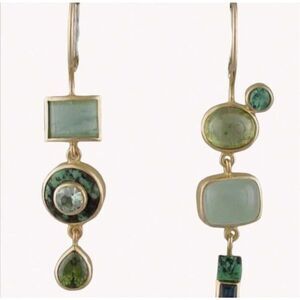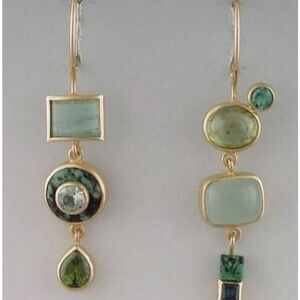 Beautiful modern pierced earrings with olive green stones in a variety of shapes in a gold setting. Beautiful modern pieces that are a lovely addition to any wardrobe.