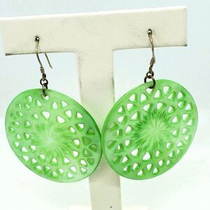 Green dyed mother of pearl carved cutout flower design dangling earrings.