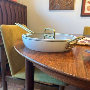 Purchased from Williams- Sonoma in the spring of 2025 and used just a few times,. It is a very beautifu and sturdy pan- just a bit bigger than I need,