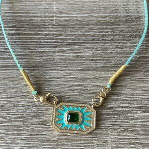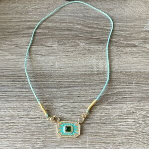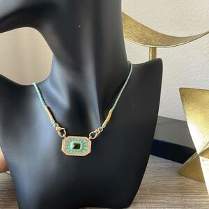 This stunning necklace features a vibrant green pendant set in a gold frame. Perfect for adding a touch of elegance to any outfit.