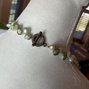 In good vintage condition. In a lovely shade of mint green seed pearls. Measures18” long with Toggle Clasp.