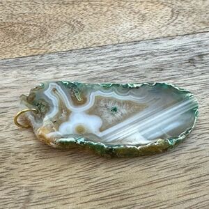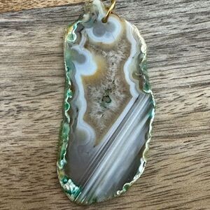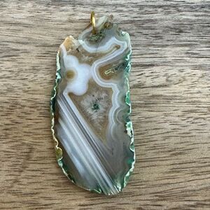 Green Tan White Agate Pendant. Very good condition. Measures approximately 2.25” long, 1” wide.