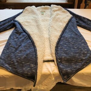 Very soft with side seam pockets. Sleeves lined. Body fleece lined. Does not close.