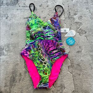 Dive into style with this eye-catching one-piece swimwear, featuring a dynamic blend of green and pink colors. The artistic pattern adds a lively touch, making it perfect for energetic days at the pool or beach.