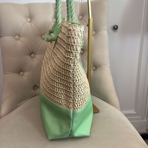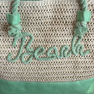 Elevate your beach style with this chic green and tan tote. Perfect for carrying all your essentials in style.
