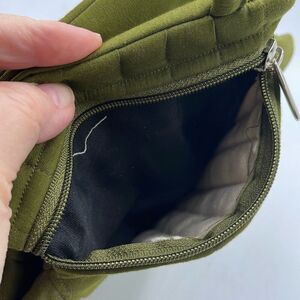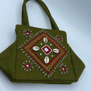 Green beaded quilted satchel. One zippered back pocket and one top zippered pocket. Double handles. Handle drop is 6”. 6” H X 6” L x 4” D. Minimal wear if any.