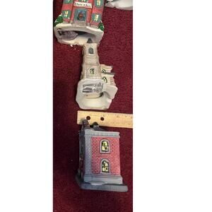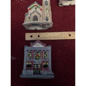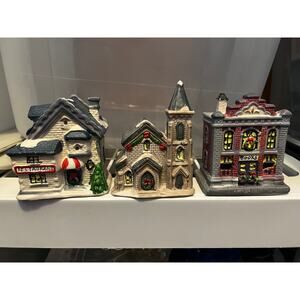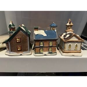 Set of 10 porcelain ceramic approx 4" buildings for Christmas village or other decorating with ability to adapt lighting into them if you choose.