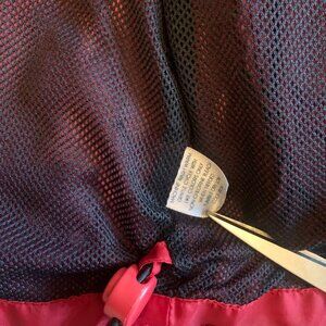 Bright red outer with a black mesh lining. All of the zippers and pockets are in great shape.