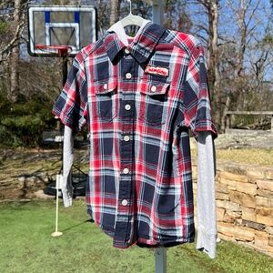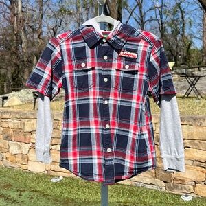 A grey hoodie and short sleeve button down plaid shirt combination.